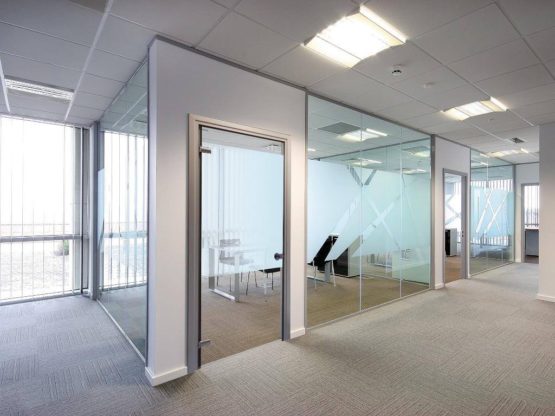 Frameless glass partitions bring the benefits of glass to the workplace – transparency,, versatility, efficiency, space saving, and low cost of ownership.